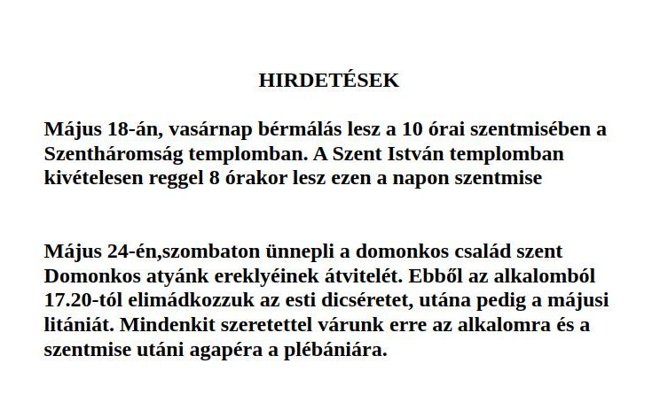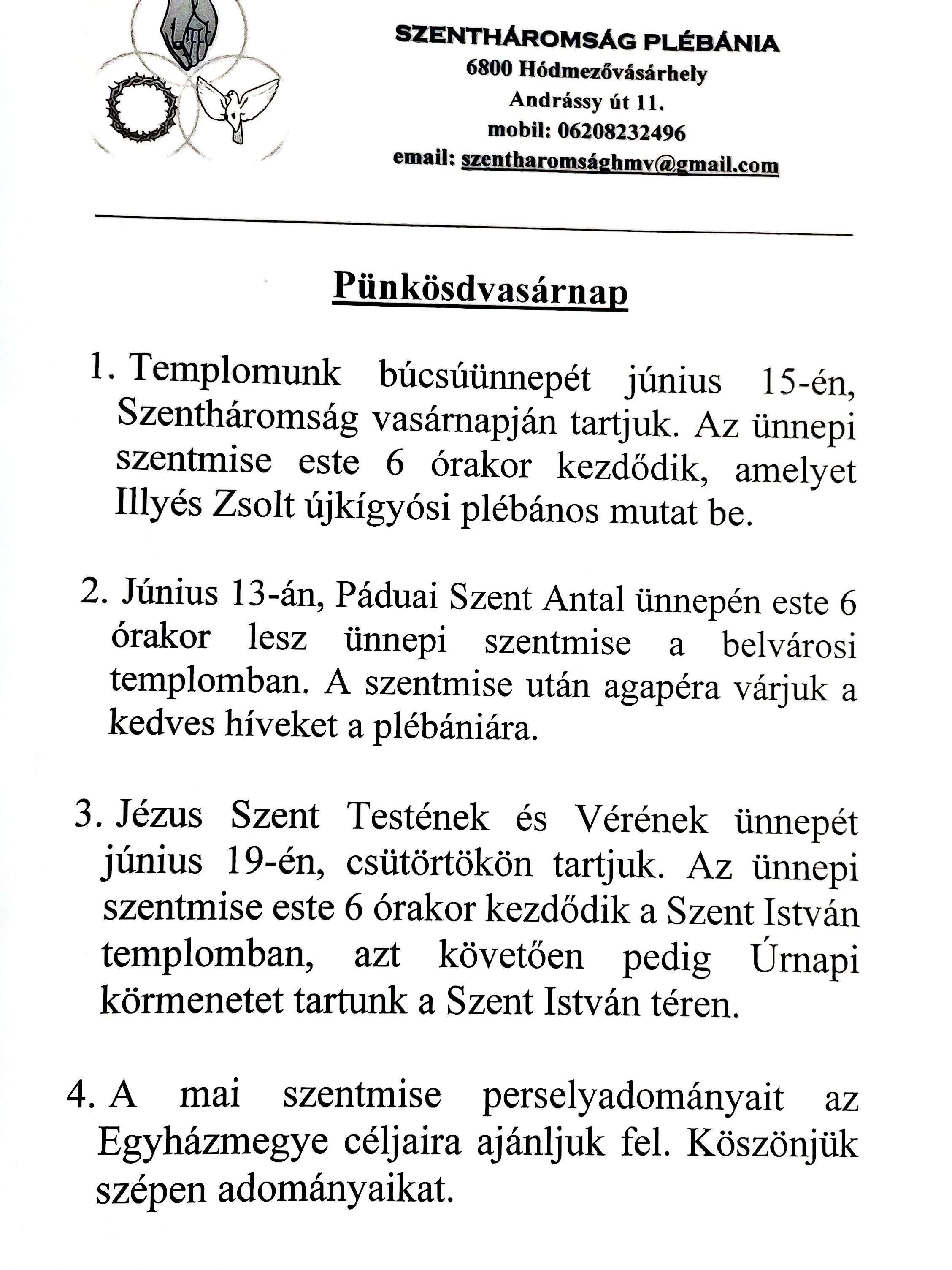 Szentháromság templomban májusban minden hétköznap 17.40-től kezdődik a Lorettói litánia imádkozása, 18 órától Szentmise.